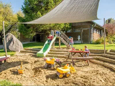 Eine Kinderidylle, die hier gelebt werden darf: Viel Platz zum Spielen und Toben, tierische Freunde, ringsherum Wiesen und Felder und jede Menge Spaß für Klein und Groß! Pony reiten, riesige Sandburgen bauen oder Ziegen füttern. Der XXL-Spielplatz mit Kletterturm, Rutsche und riesigem Sandkasten wartet nur darauf, von kleinen Entdeckern erobert zu werden. Und wenn es mal regnet?! Kein Problem - im großen Spielehaus sorgen ein Kletterturm, große Maltafeln und eine Spielecke mit Höhle und Kaufladen für kunterbunte Unterhaltung. Beim Kicker oder Tischtennis können sich auch die Eltern fröhliche und laute Matches liefern.